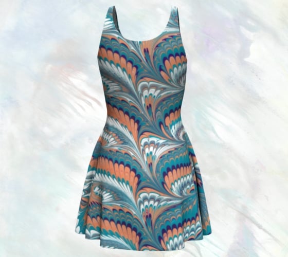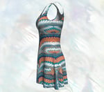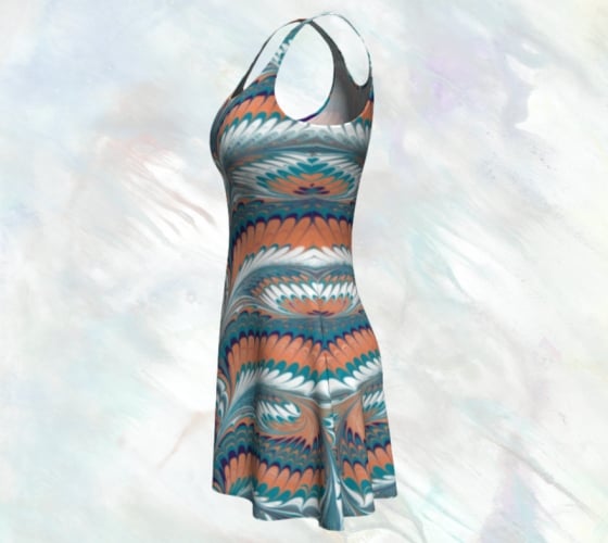 This flared dress features a tailored bodice and an A-line skirt that falls mid-thigh. Crafted from ultra-soft Luxeform™ fabric, it offers a comfortable fit with a smooth, flattering drape. The vibrant, permanent print blends turquoise for healing and protection, orange for creativity and joy, and white for clarity and renewal—colors that stay bright and beautiful wash after wash.