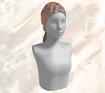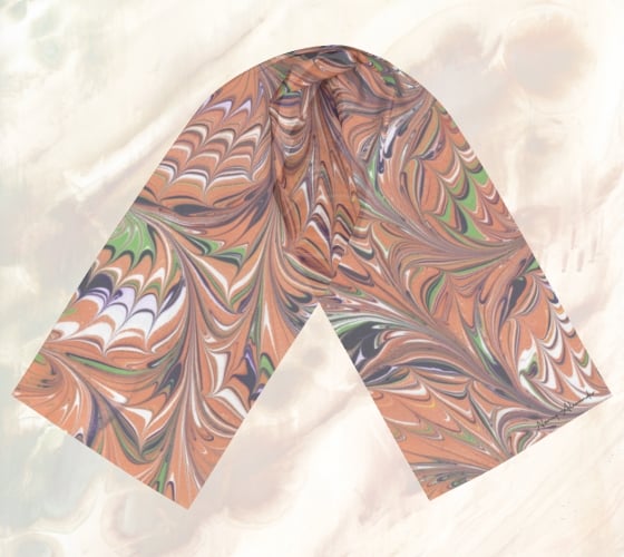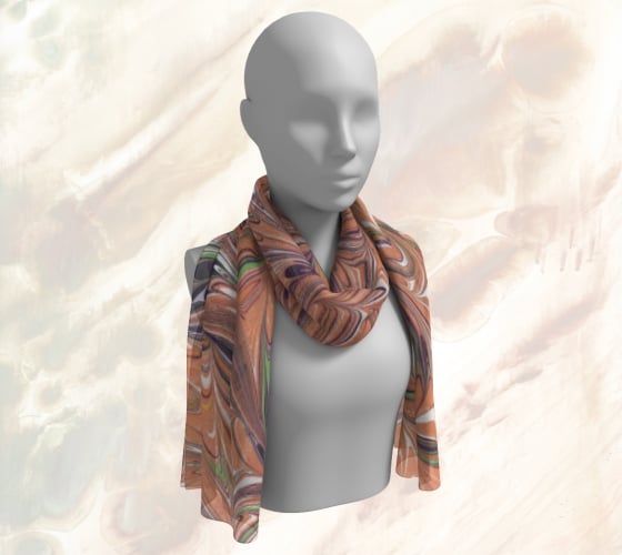 This scarf offers swirl of orange and green, mingled with black and white, like autumn leaves caught in the wind. It gives you a lively dance of warmth and shadow that captures the spirit of fall.